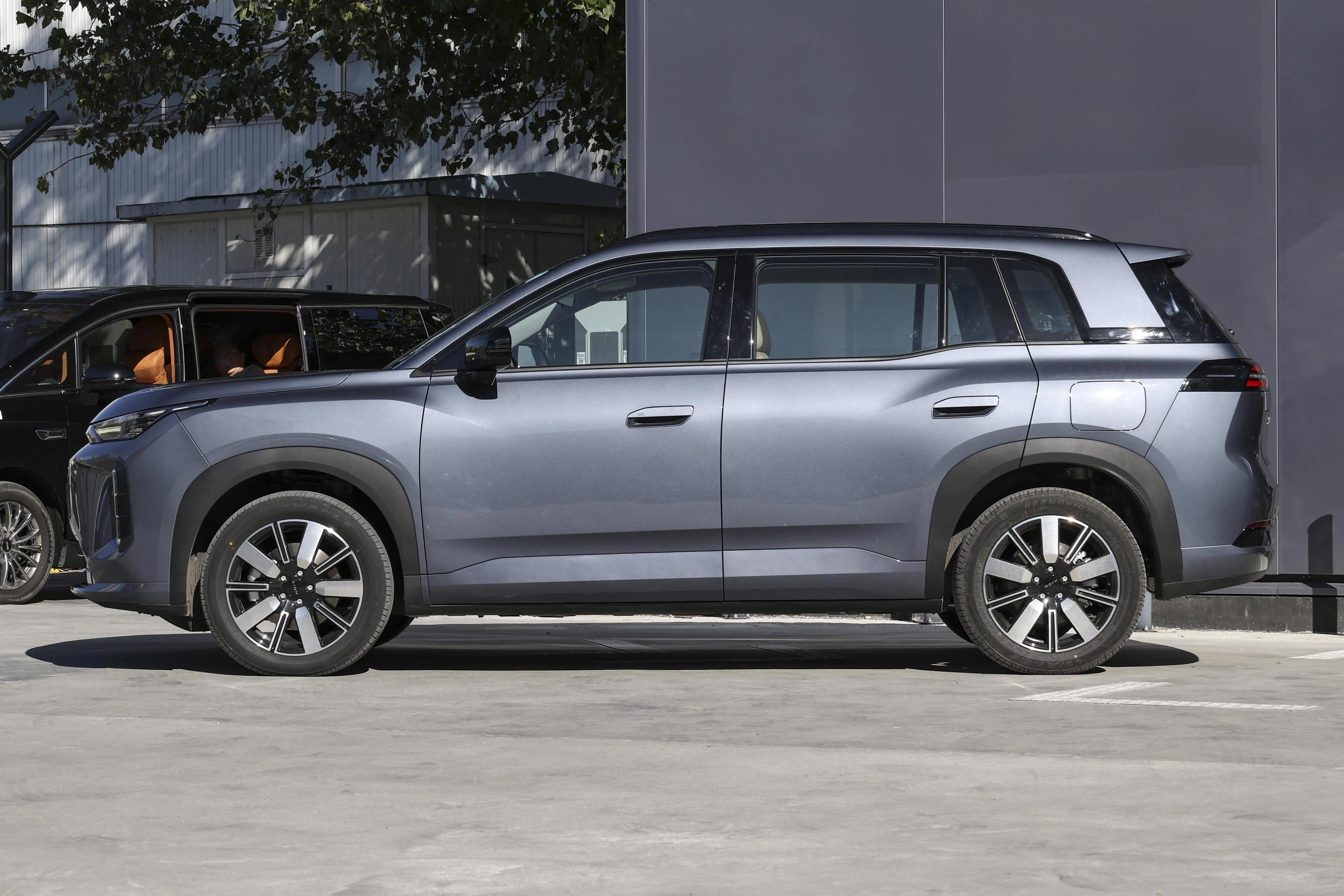 侧面造型方面,车顶略带一点弧度,配备有粗壮的行李架,同样是力量感比较强的类型;腰线采用了分段式设计,点缀出了车身侧面的层次感;门把手采用的是半隐藏式设计,兼顾了低风阻以及实用性;轮眉和侧裙部分设计有隆起的饰板,进一步增强了力量感;轮毂采用了五辐式造型,风格还算简洁。