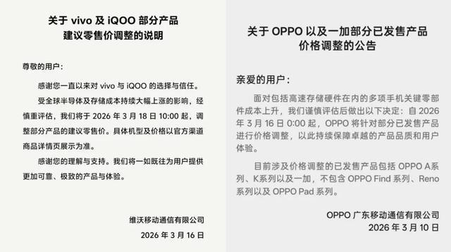 我估计很多人和我一样,本来还抱有一丝不会涨价的期待。但现实就是厂商真顶不住压力了,新机涨价就算了,老机型也调价,目前 OPPO 和 vivo 两家已经官宣调价。